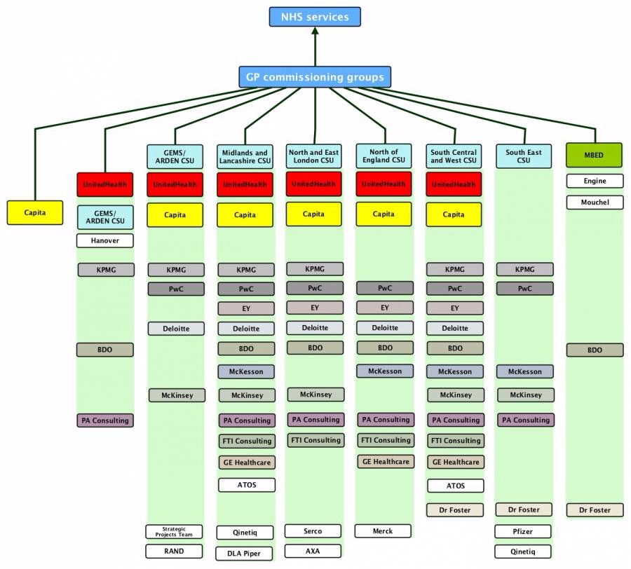 There are nine consortia set up to ‘supply’ local health purchasing decisions. UnitedHealth, Capita, KPMG and PwC are now approved suppliers to two thirds of them. McKinsey and EY are suppliers to half of them.