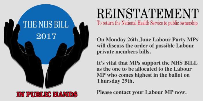 If you have a Labour MP, please ask them to attend this Parliamentary Labour Party discussion and support Margaret Greenwood’s NHS Bill as the one to be allocated to the Labour MP who comes highest in the ballot for Private Members Bills.