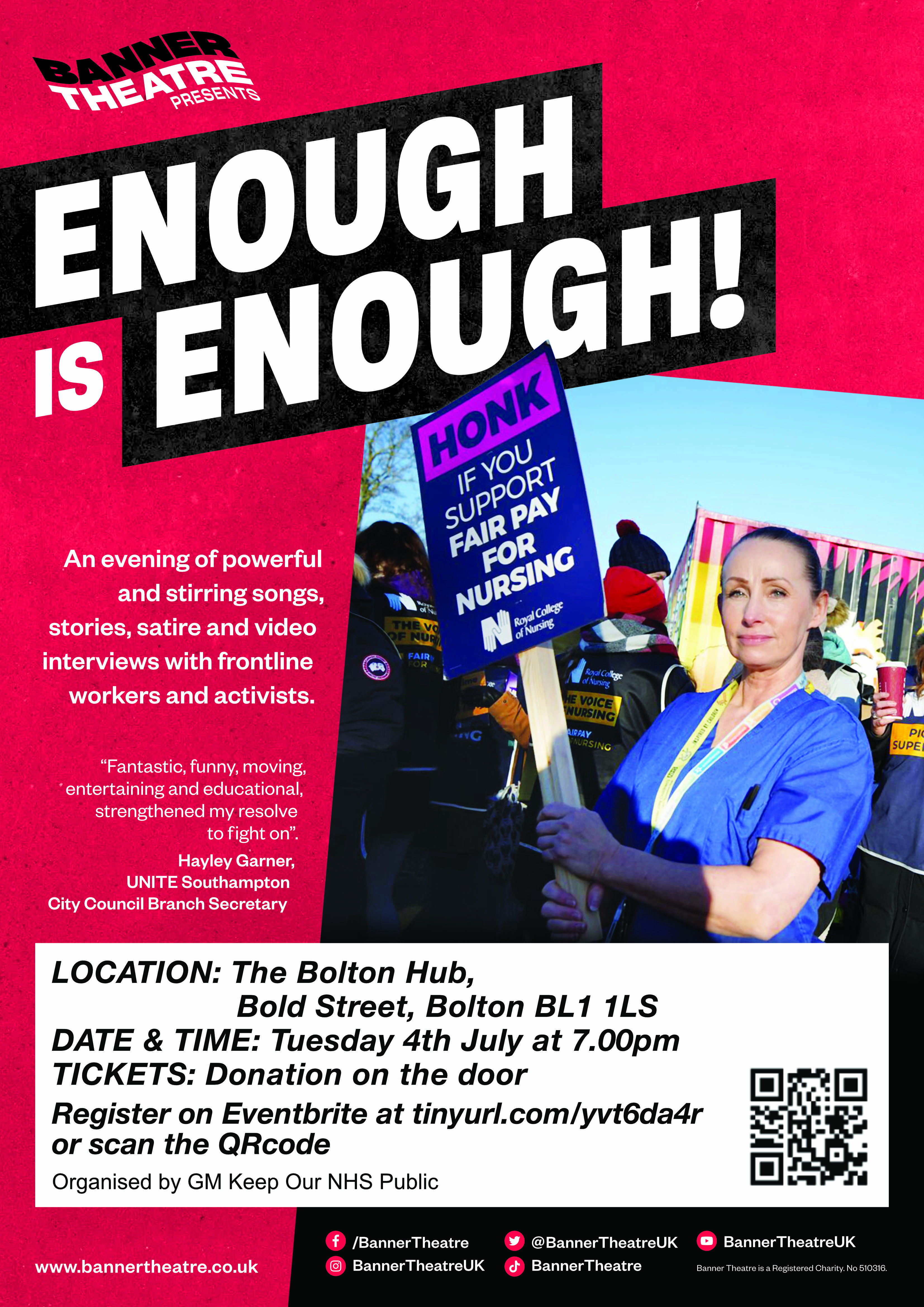 GMKONP have organised 2 presentations of Banner Theatre’s current production ‘ Enough is Enough’. One in Bolton on 4th July and the other in Stockport on 5th July to coincide with the 75th Birthday of our NHS.