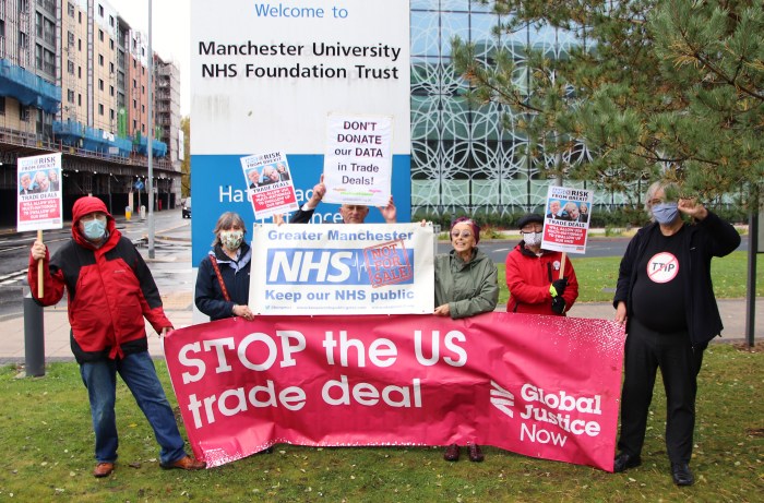Members of Greater Manchester Keep Our NHS Public and Manchester Global Justice Now protested the UK-US trade deal, in person but socially distanced, from 11-12noon, on Saturday 24th October, outside the Hathersage Rd entrance to MRI. Show your support online for the MANCHESTER action this SATURDAY 24th OCTOBER..message your support to the KONP Greater Manchester Facebook livestream, Global Justice Now … Continue reading Defend the NHS from toxic trade deal. Stand Up for the NHS from your sofa
